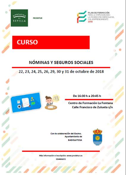 Los días 22, 23, 24, 25, 26, 29, 30 y 31 de Octubre se va a celebrar en Badolatosa un Curso de Nóminas y Seguros Sociales , impartido por PRODETUR y que cuenta con la colaboración del Ayuntamiento de Badolatosa. Se llevará a cabo en horario de tarde, de 16:30 a 20:45 h, en el Centro de Formación La Fontana.