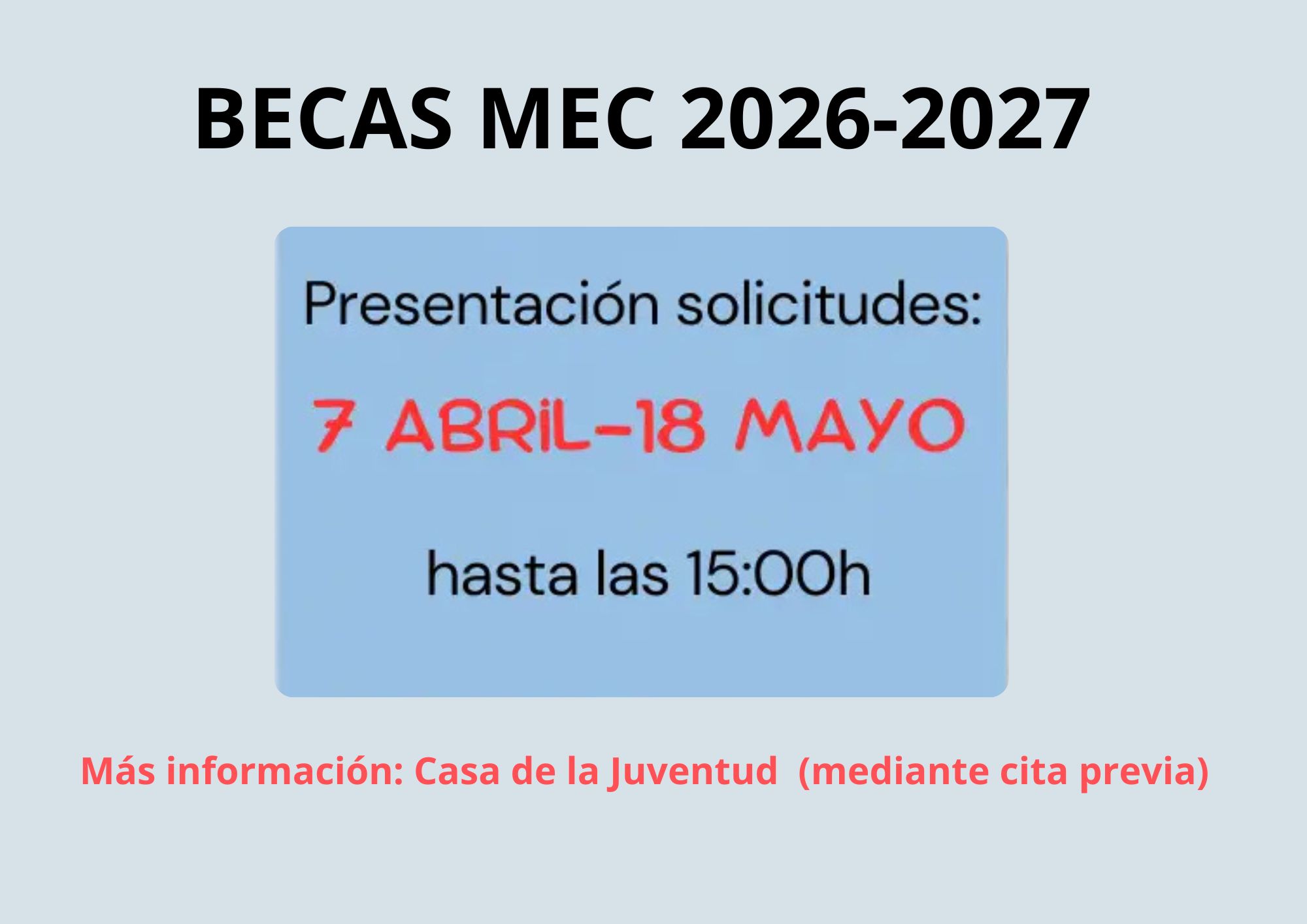 La Delegación de Juventud del Ayuntamiento informa que ya está abierto el plazo de solicitud de las becas del Ministerio de Educación, Formación Profesional y Deportes, curso 2026-2027.
