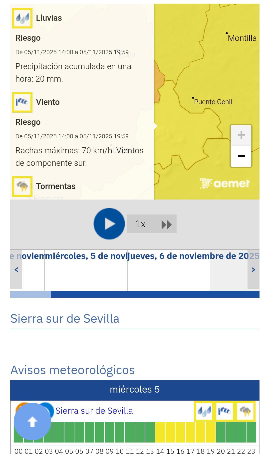 Según la información facilitada por la Agencia Estatal de Meteorología (AEMET), se encuentra activada la alerta amarilla para hoy miércoles, 5 de noviembre, en la Sierra Sur de Sevilla, entre las 14:00 h y las 20:00 h.