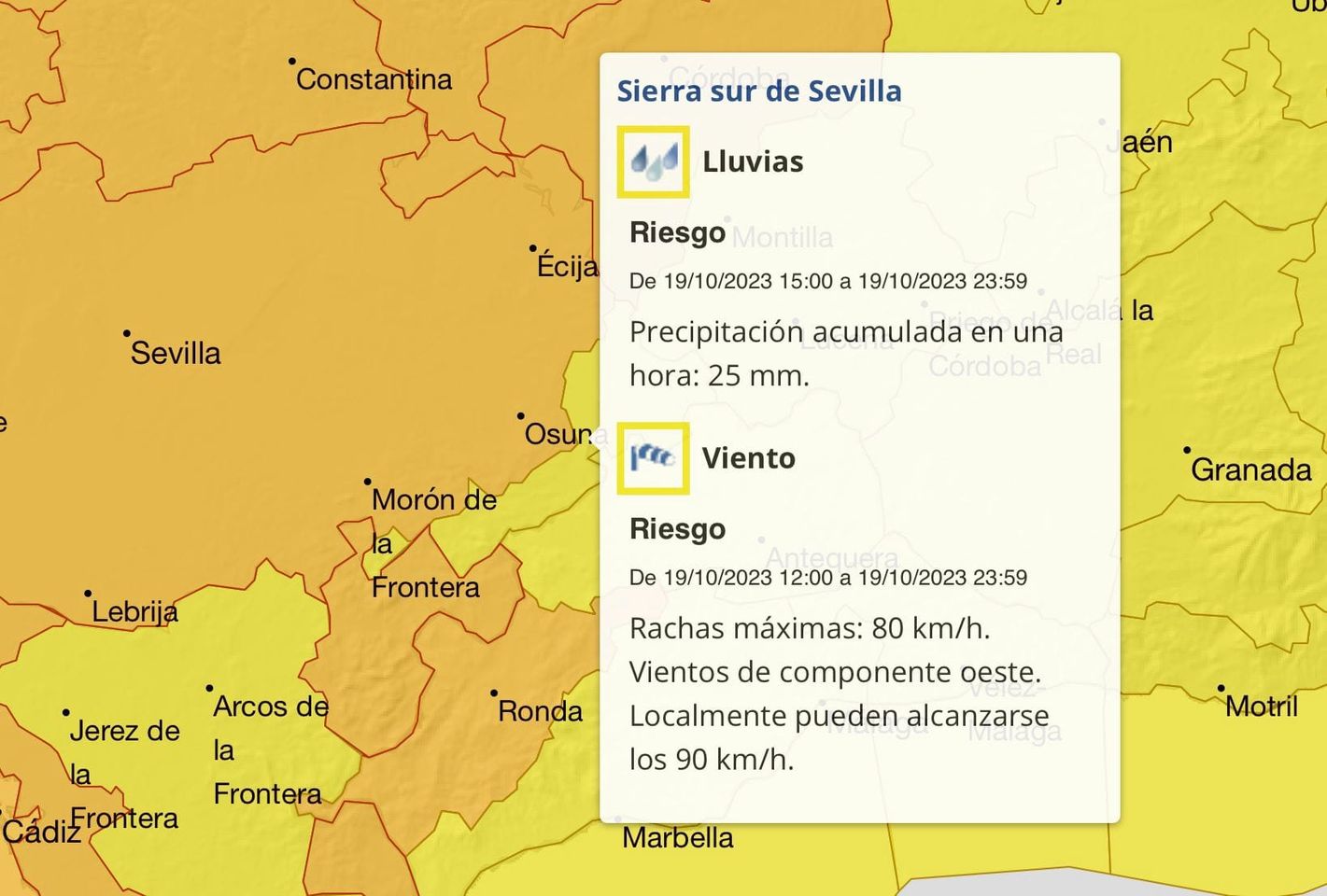 La Agencia Estatal de Meteorología, AEMET, ha activado la alerta amarilla por lluvias y fuertes rachas de viento, que pueden llegar hasta los 80 km/h, hoy jueves 19 de octubre, a partir de las 15:00 h y hasta las 23:59 h, en toda la Sierra Sur.