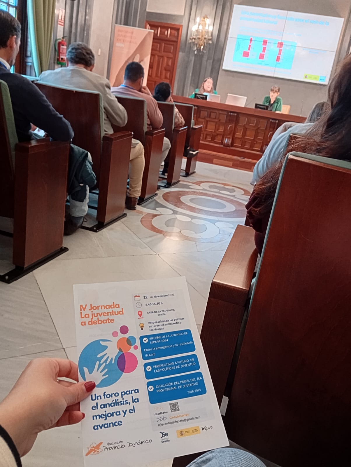 Nuestra Técnica de Juventud asistió ayer miércoles a la IV Jornada “La Juventud a Debate”, celebrada en la Casa de la Provincia de la Diputación de Sevilla. Este foro, impulsado por la Asociación Provincia Dynámica con la colaboración de la Institución Provincial —a través del Servicio de Juventud del Área de Cultura y Ciudadanía—, se ha consolidado como un punto de encuentro y reflexión para los profesionales que trabajan con la juventud en toda la provincia.