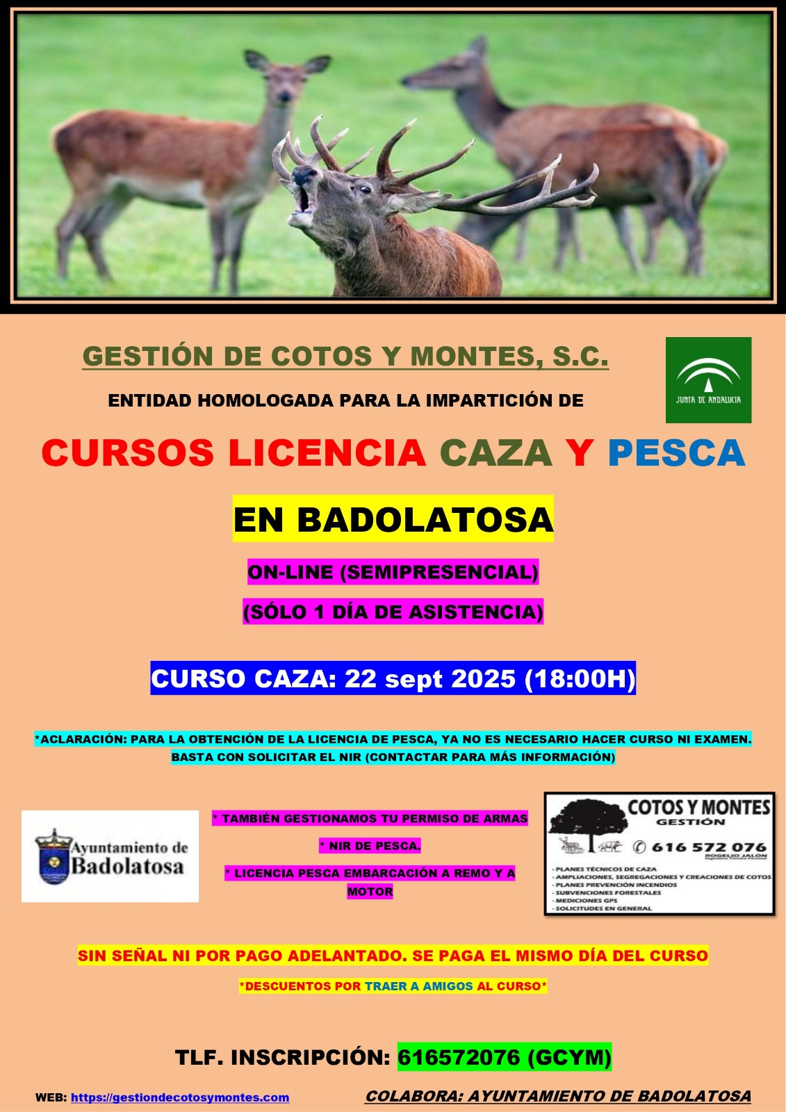 La entidad Gestión de Cotos y Montes, S.C., homologada para la impartición de cursos oficiales de Licencia de Caza y Pesca, organiza un Curso de Licencia de Caza en Badolatosa el próximo 22 de septiembre a las 18:00 horas.