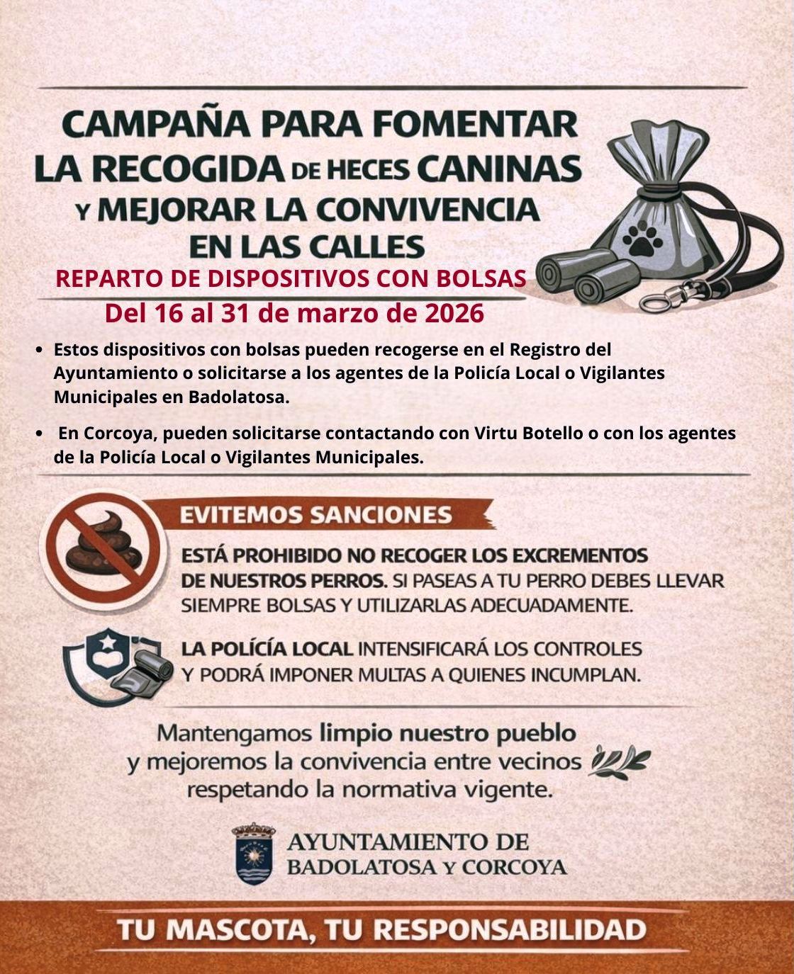 El Ayuntamiento de Badolatosa y Corcoya va a poner en marcha una nueva iniciativa para promover el civismo y mejorar la limpieza de los espacios públicos. Como parte de esta campaña, distribuirá del 16 al 31 de marzo dispositivos con bolsas para la recogida de heces de perros entre los vecinos y vecinas propietarios de mascotas.