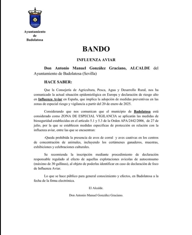 Habiendo sido informados por la Oficina Comarcal Agraria de La Campiña Sierra Sur sobre la necesidad de adoptar medidas preventivas contra la Influenza Aviar y dado que nos han comunicado que Badolatosa está considerada como ZONA DE ESPECIAL VIGILANCIA, se da conocimiento a dichas medidas y recomendaciones a través del siguiente Bando de Alcaldía.