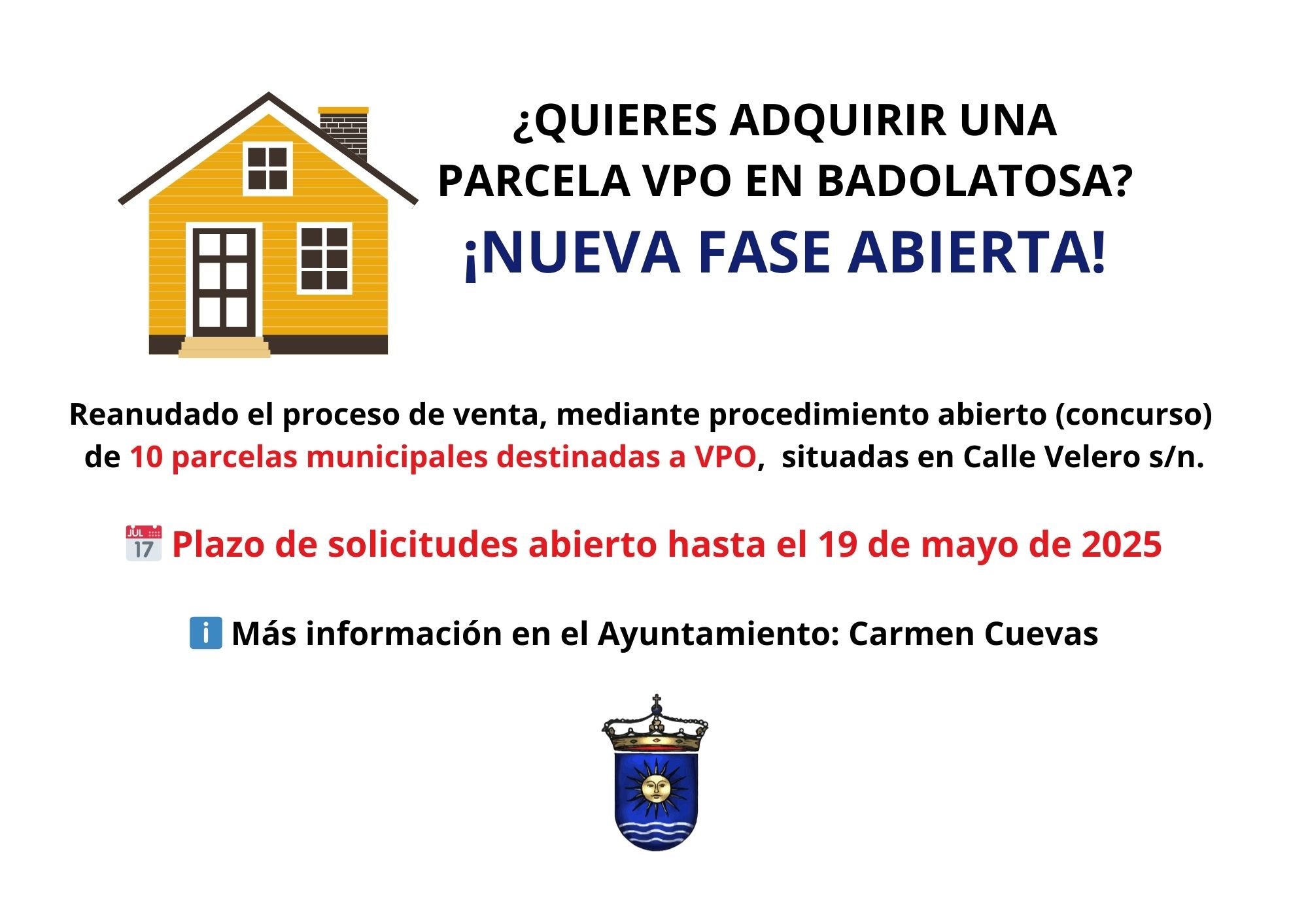 El Ayuntamiento de Badolatosa informa que, tras la adjudicación de dos de las doce parcelas inicialmente ofertadas en la promoción municipal de VPO situada en Calle Velero s/n, se abre una nueva fase de venta mediante procedimiento abierto (concurso) para las diez parcelas restantes.