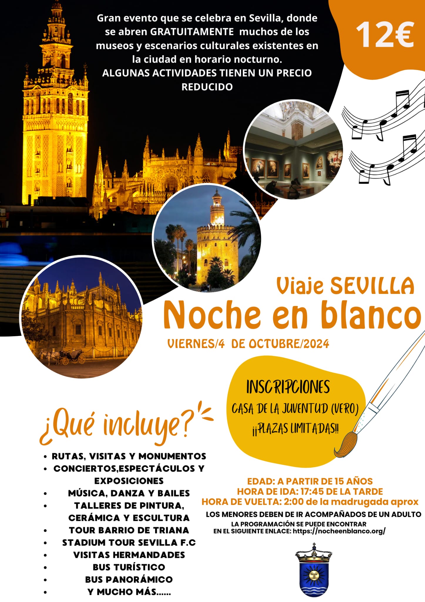 Desde la Delegación de Juventud de nuestro Ayuntamiento hemos organizado un viaje a Sevilla el próximo 4 de octubre, fecha en la que se celebra en la capital hispalense la undécima edición de la ‘Noche en blanco’, una propuesta con una programación cultural nocturna muy atractiva, variada y para todos los gustos.
