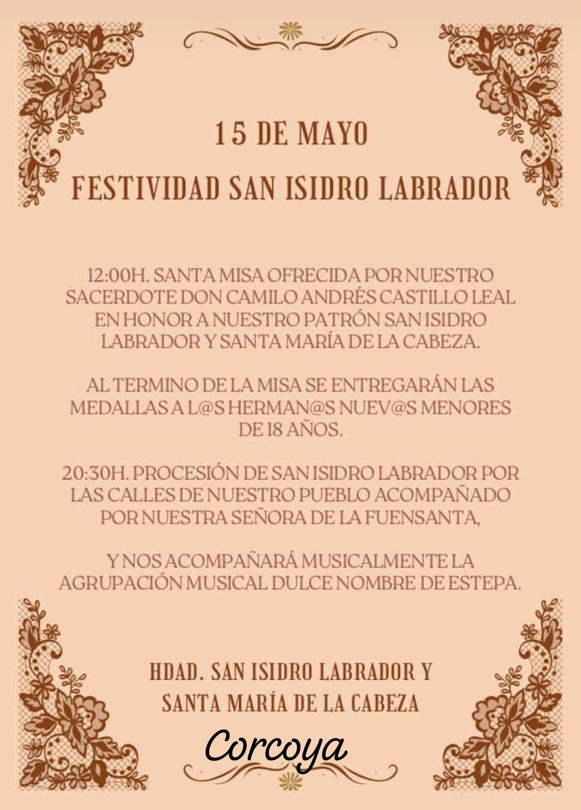 - A las 20:30 h, tendrá lugar la procesión de San Isidro Labrador, acompañado por Ntra. Sra. de la Fuensanta, recorriendo las calles de Corcoya. El cortejo estará amenizado por la música de la Agrupación Musical Dulce Nombre de Estepa.