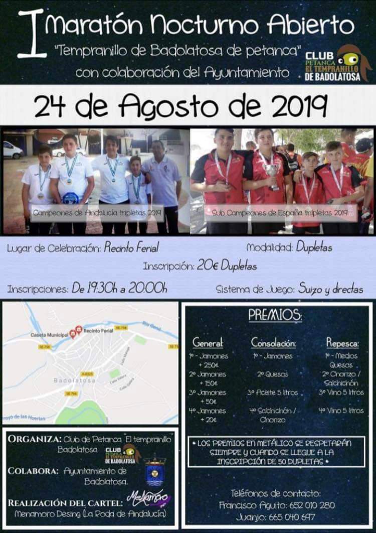 El Recinto Ferial de nuestro municipio acoge el sábado 24 de Agosto el I Maratón Nocturno Abierto "Tempranillo de Badolatosa de Petanca", que se llevará a cabo en modalidad de dupletas.