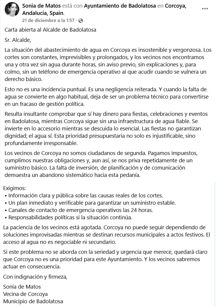 En respuesta a la carta abierta de una vecina a la Alcaldía del Ayuntamiento de Badolatosa y Corcoya, en primer lugar, quisiéramos informarle y exigirle que para otra vez, existen unos mecanismos formales en la web del Ayuntamiento, a través de la sede electrónica, en el apartado Avisos, Quejas y Sugerencias, o presencialmente en la ventanilla del Registro, con los cuales se queda registrada su petición, de modo que usted pueda hacerla pública si posteriormente lo desea, en vez de hacerlo directamente a través de las redes sociales.