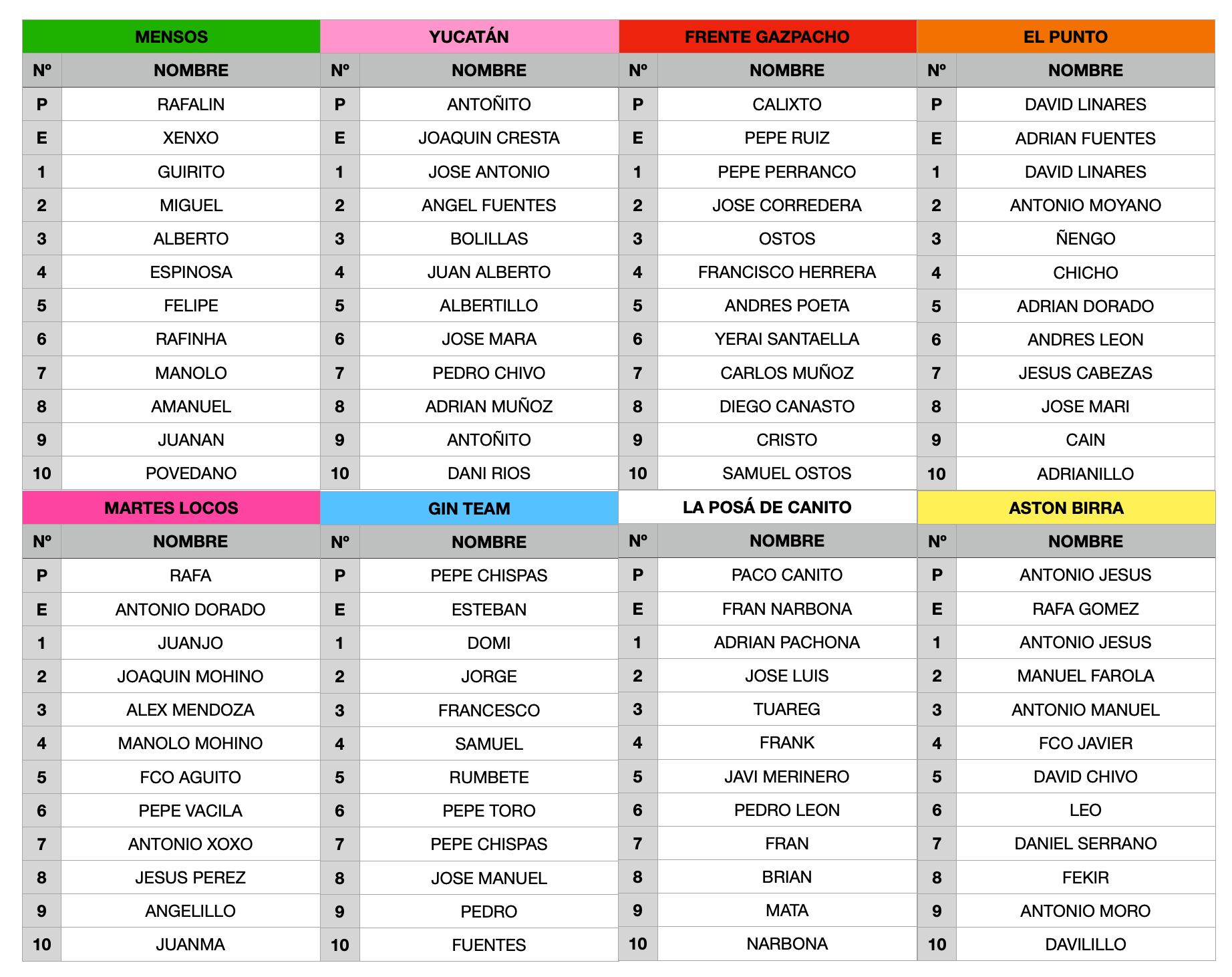 Incluimos a continuación las plantillas de los 8 equipos que compiten, los horarios y enfrentamientos de todas las jornadas, deseando mucha suerte a todos los participantes; Mensos, Yucatán, Frente Gazpacho, El Punto, Martes Locos, Gin Team, La Posá de Canito, Martes Lokos, y Aston Birra.