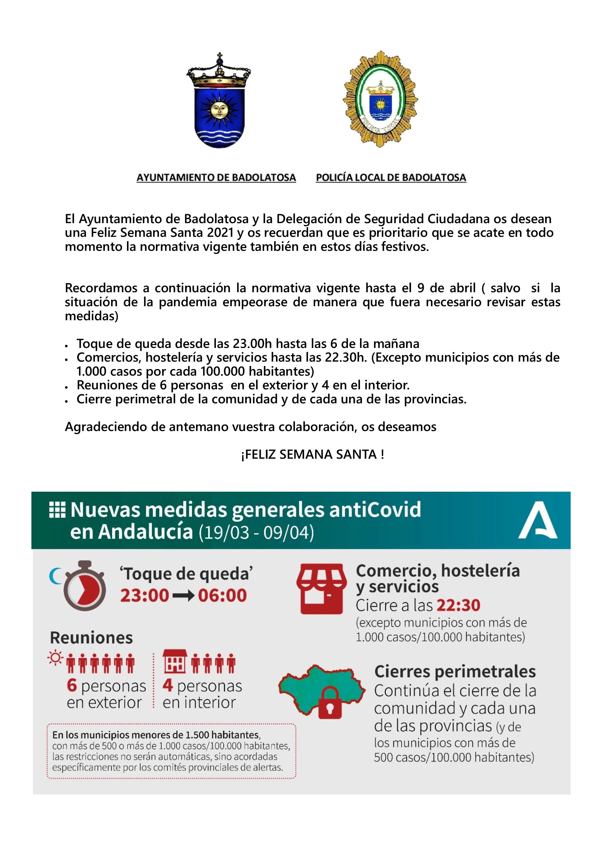 El Ayuntamiento de Badolatosa y la Delegación de Seguridad Ciudadana os desean una Feliz Semana Santa 2021 y os recuerdan que es prioritario que se acate en todo momento la normativa vigente también en estos días festivos.