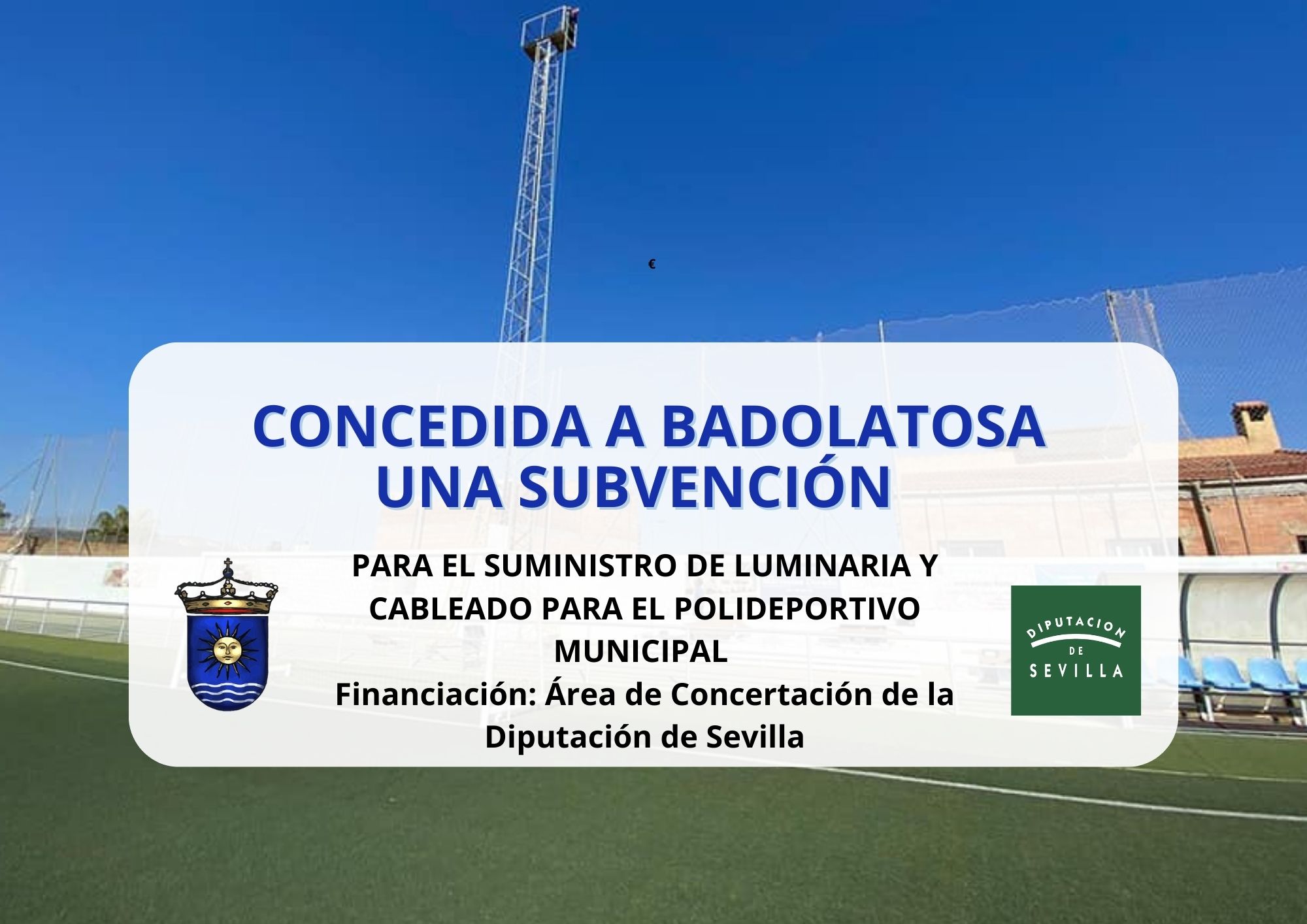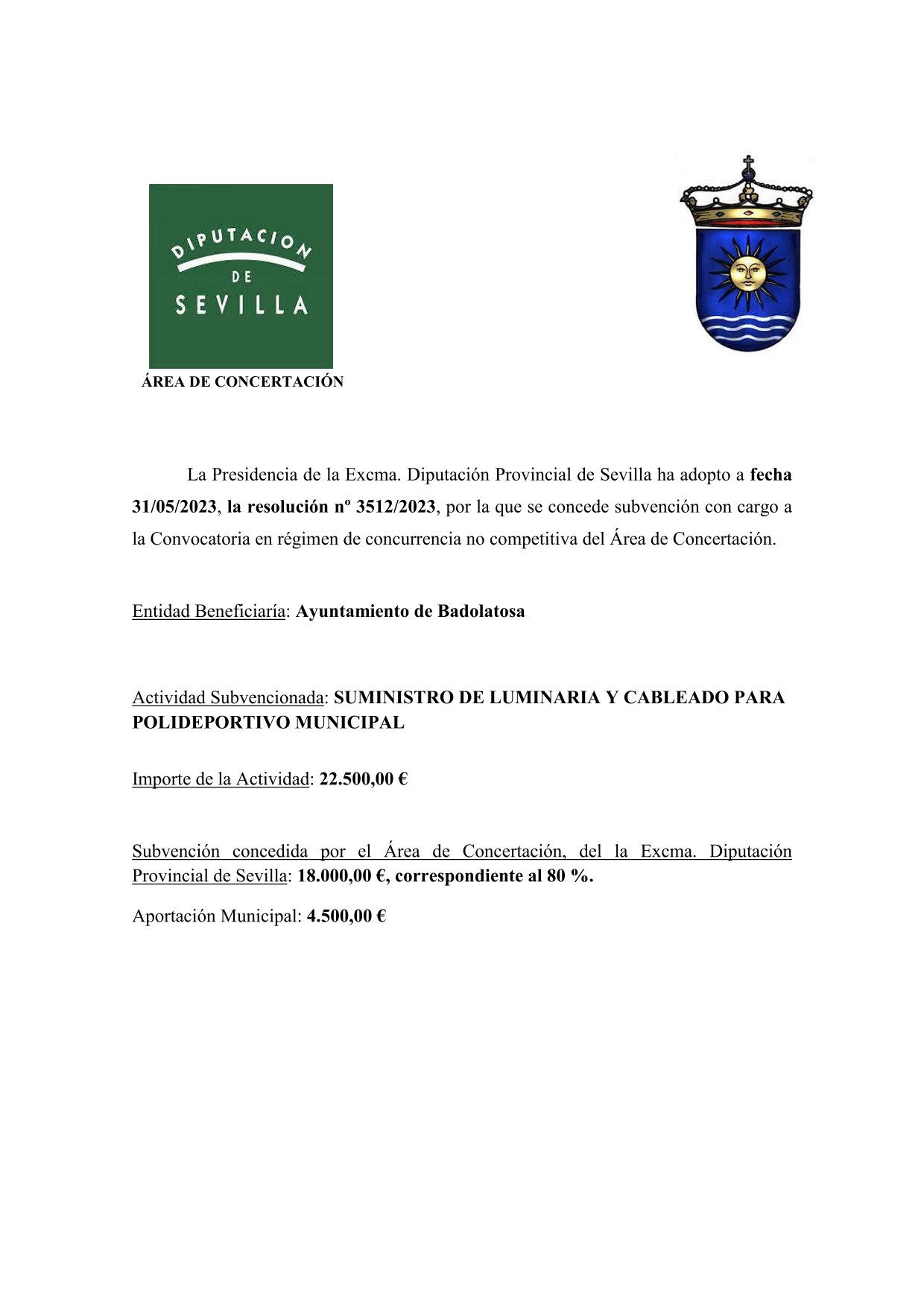 Nuestro municipio ha recibido una subvención del Área de Concertación de la Diputación de Sevilla destinada a suministro de luminaria y cableado para el Polideportivo Municipal.