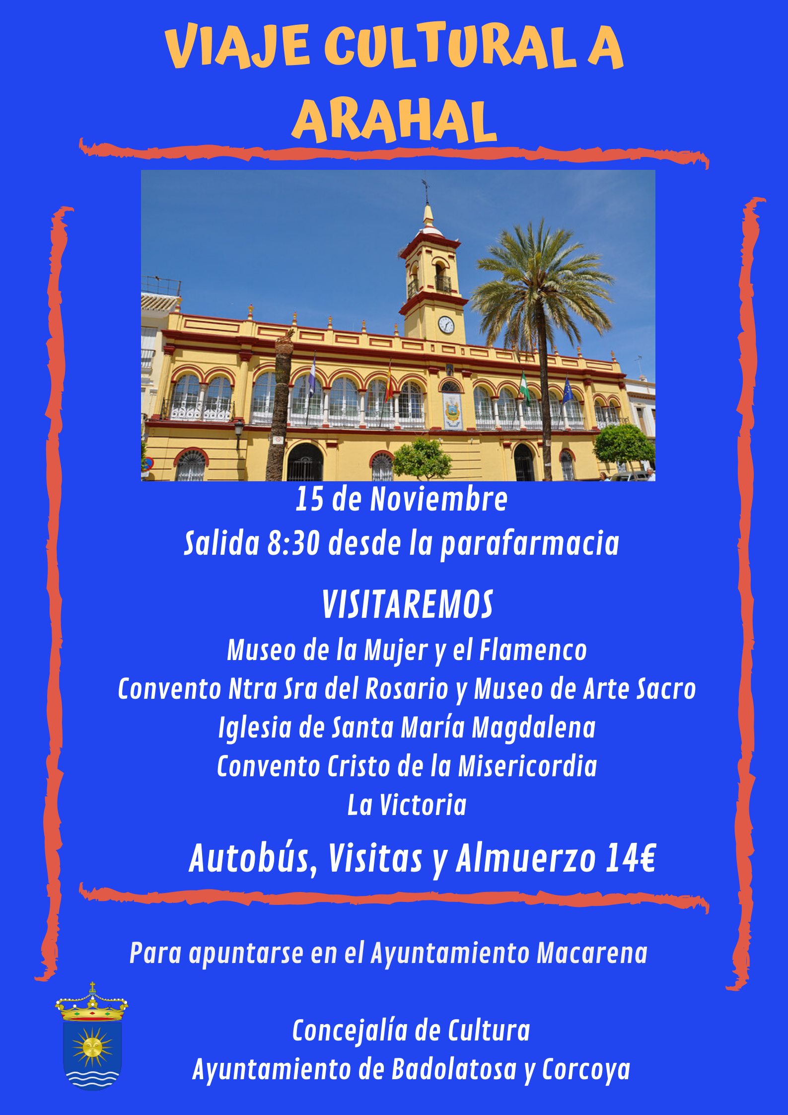 Desde la Concejalía de Cultura de nuestro Ayuntamiento, hemos organizado un viaje cultural a Arahal para el 15 de Noviembre.