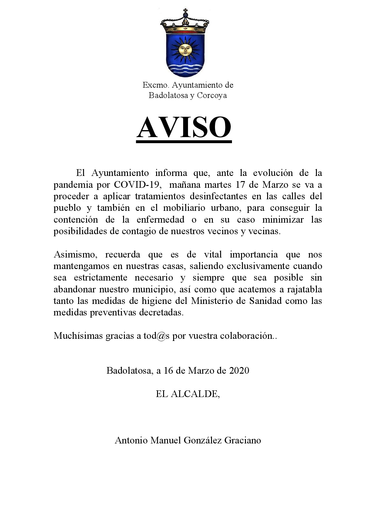 El Ayuntamiento informa que, ante la evolución de la pandemia por COVID-19, mañana martes 17 de Marzo se va a proceder a aplicar tratamientos desinfectantes en las calles del pueblo y también en el mobiliario urbano, para conseguir la contención de la enfermedad o en su caso minimizar las posibilidades de contagio de nuestros vecinos y vecinas.