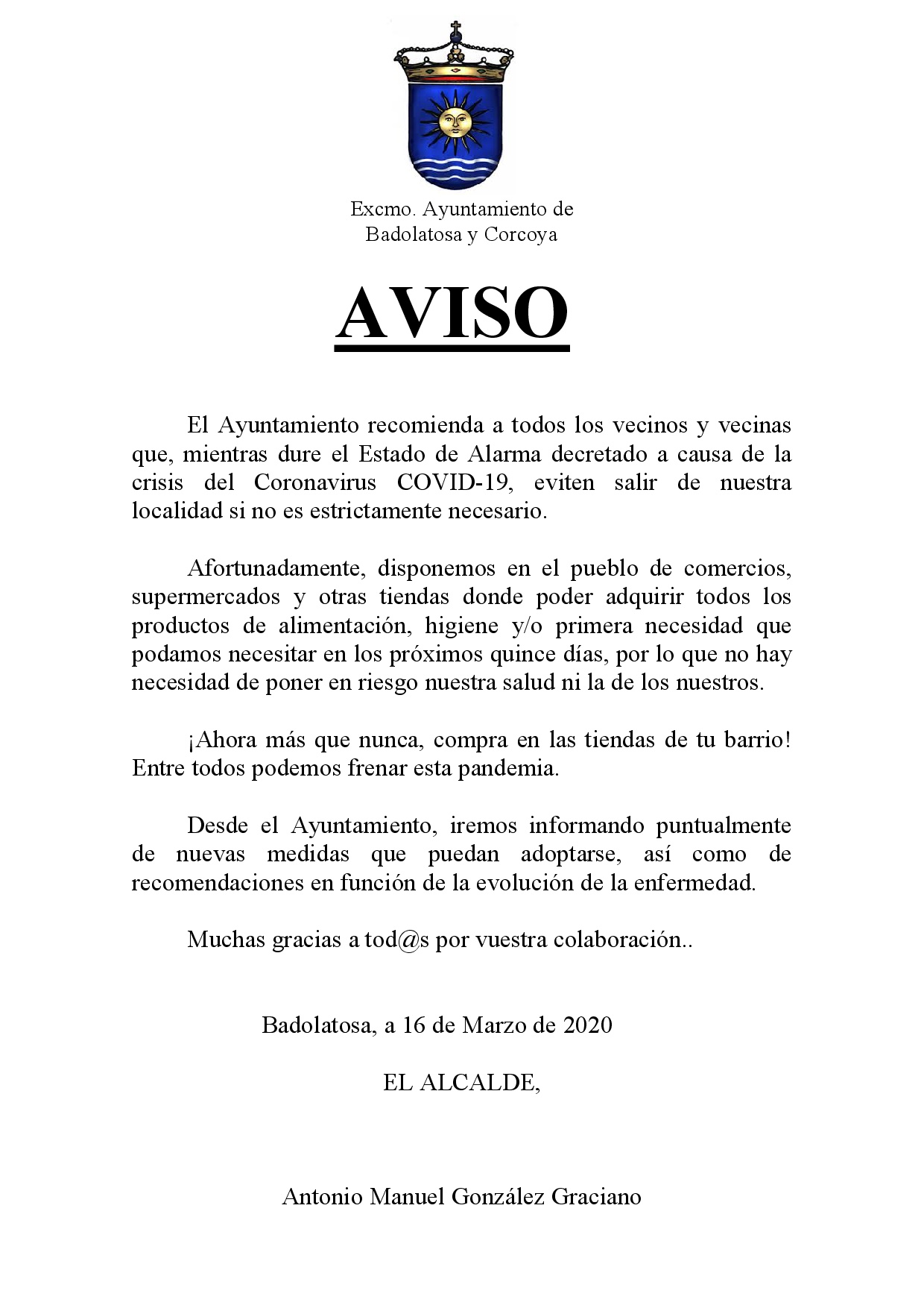 El Ayuntamiento recomienda a todos los vecinos y vecinas que, mientras dure el Estado de Alarma decretado a causa de la crisis del Coronavirus COVID-19, eviten salir de nuestra localidad si no es estrictamente necesario.