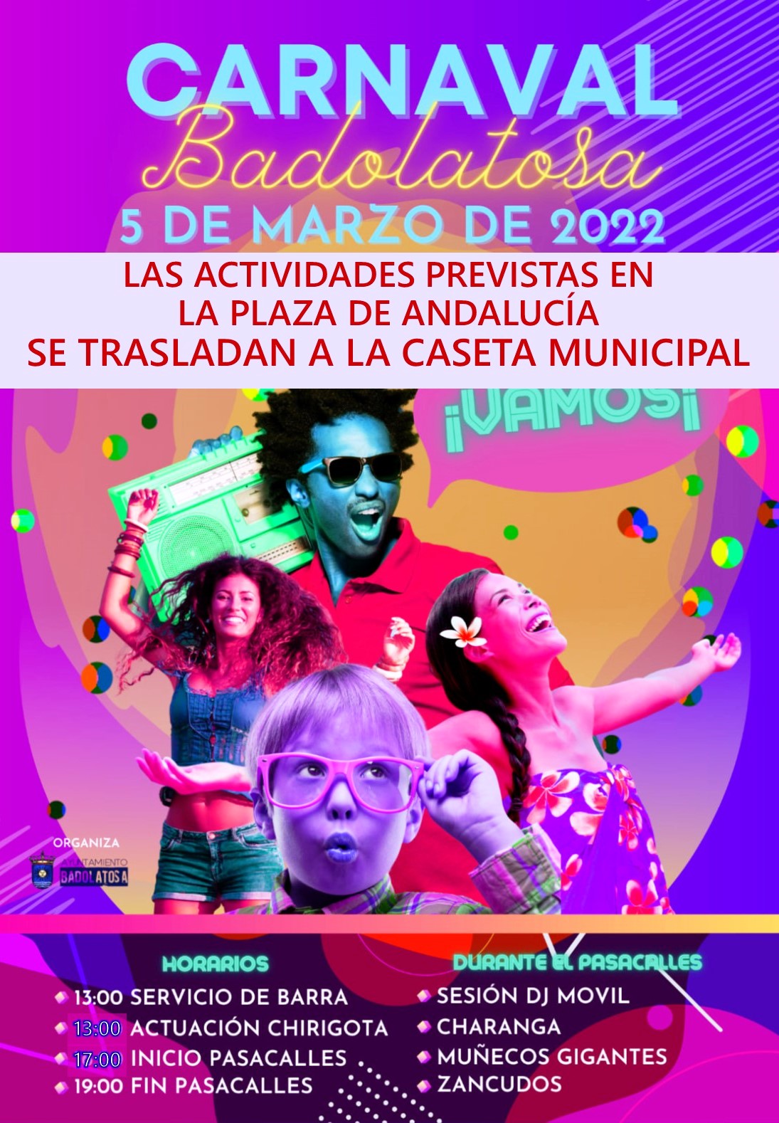 Las previsiones de frío, viento e inestabilidad para mañana sábado, 5 de Marzo, día en que celebramos nuestro carnaval, nos han hecho tomar la decisión de que las actividades previstas se trasladen a la Caseta Municipal, donde, a partir de las 13:00 h, habrá servicio de barra, con paella gratis.