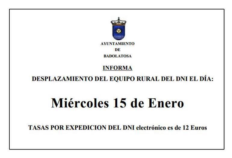EL EQUIPO RURAL DEL DNI VISITARÁ BADOLATOSA EL 15 DE ENERO