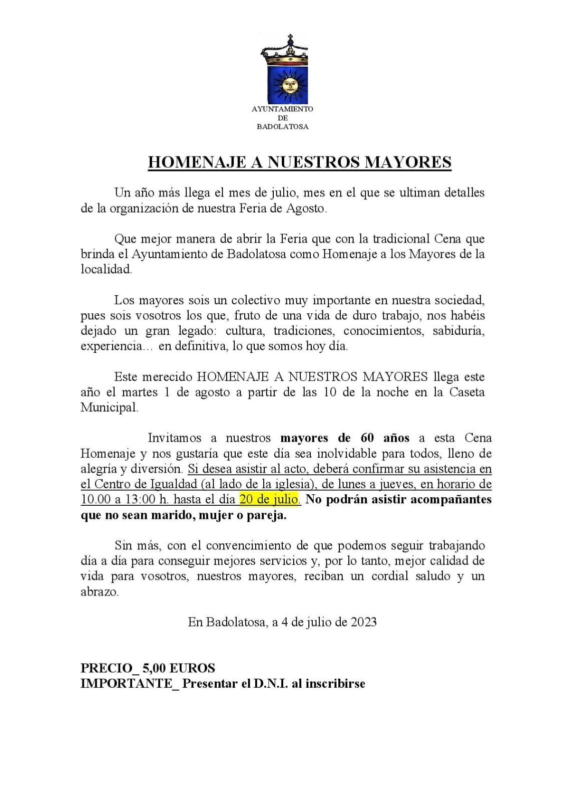 Se informa a todas y todos los mayores de nuestro pueblo que deseen asistir al acto, que deberán confirmar su asistencia en el Centro de Igualdad (al lado de la iglesia), de lunes a jueves, en horario de 10.00 a 13:00 h. hasta el día 20 de julio. No podrán asistir acompañantes que no sean marido, mujer o pareja.
