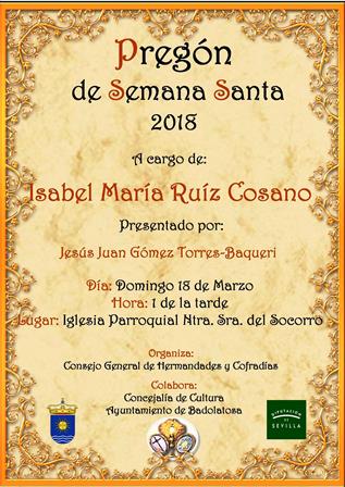 Isabel Mª Ruíz Cosano es la pregonera de la Semana Santa 2018 , que será presentada por Jesús Juan Gómez Torres-Baqueri. La cita con este acto anunciador de nuestra Semana Santa es el domingo 18 de marzo a partir de la una de la tarde en la Iglesia Parroquial de Ntra. Sra. del Socorro.