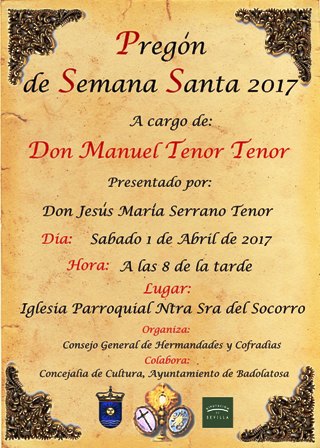 Manuel Tenor Tenor será el pregonero de nuestra Semana Santa 2017, siendo presentado por Jesús Mª Serrano Tenor. El Pregón se celebrará el sábado 1 de Abril, a las ocho de la tarde en la Iglesia Parroquial de Ntra. Sra. del Socorro.