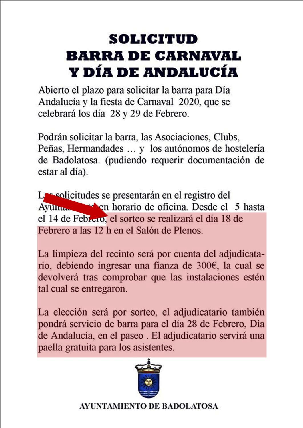 Se recuerda a todas las personas que han presentado solicitud para hacerse cargo de la barra del Carnaval y del Día de Andalucía, que el sorteo se llevará a cabo mañana 18 de Febrero, a las 12:00 del mediodía, en el Salón de Plenos del Ayuntamiento.