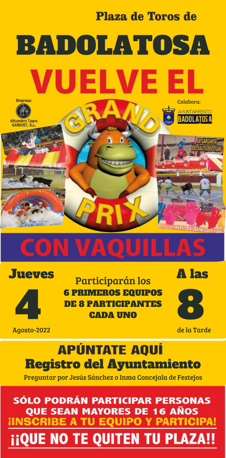 Este 2022 recuperamos nuestra Feria y Fiestas Populares en honor a Ntra. Sra. del Socorro, y dentro de las actividades previstas, os anunciamos hoy que vuelve el Grand Prix con vaquillas, y se llevará a cabo el jueves 4 de Agosto, a partir de las 8 de la tarde. Podrán participar los ocho primeros equipos (de 6 participantes cada uno).
