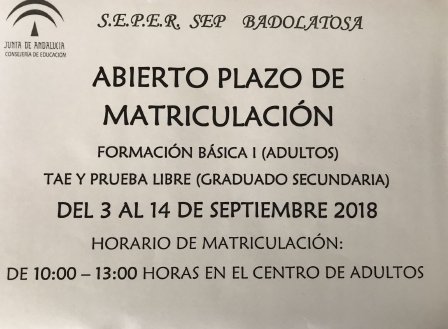 INFORMACIÓN SOBRE EL PLAZO DE MATRICULACIÓN EN EL CENTRO DE ADULTOS (CURSO 2018/2019)