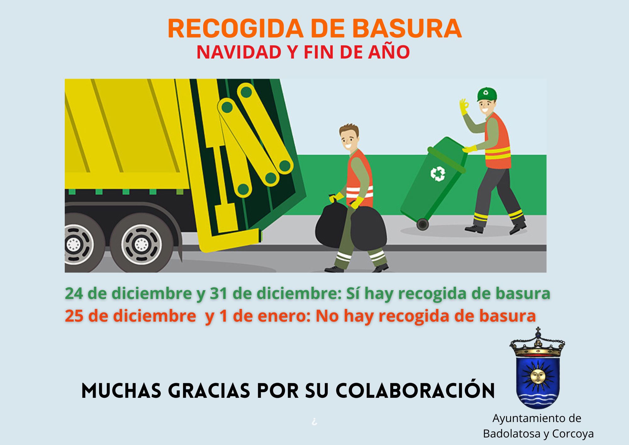 El Ayuntamiento informa que los días 24 de diciembre (NOCHEBUENA) y 31 de diciembre (NOCHEVIEJA) sí hay recogida de basura y que los días 25 de diciembre (NAVIDAD) y 1 de enero (AÑO NUEVO) no habrá servicio de recogida de basura.