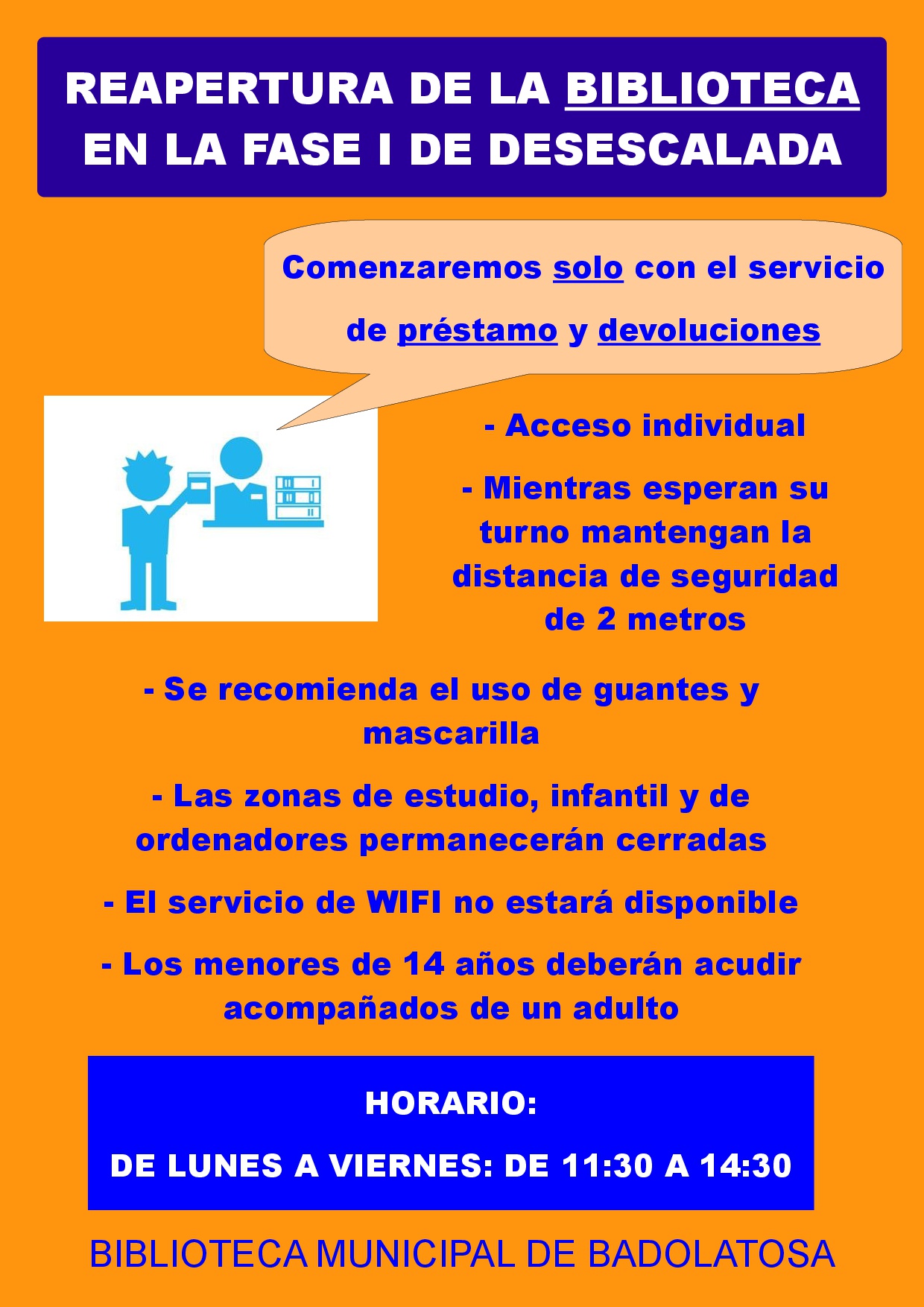 Las zonas de estudio, infantil y de ordenadores permanecerán cerradas, no estará disponible el servicio WIFI y los menores de 14 años deberán acudir acompañados de un adulto.