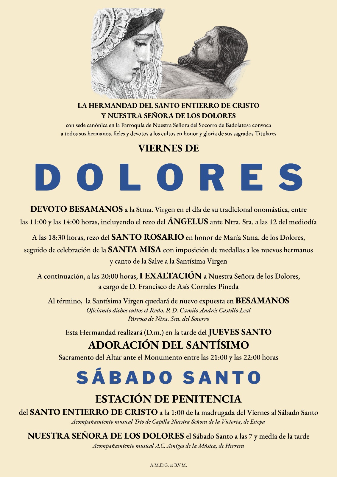 La Hermandad del Santo Entierro y Nuestra Señora de los Dolores ha dado a conocer el programa de cultos y actos que celebrará con motivo de la Semana Santa 2026, destacando este año como principal novedad la celebración de la I Exaltación a la Virgen de los Dolores, que tendrá lugar tras la misa del Viernes de Dolores.