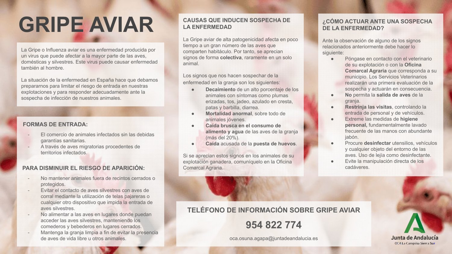 La Oficina Comarcal Agraria (OCA) La Campiña Sierra Sur informa a la ciudadanía sobre la necesidad de adoptar medidas preventivas frente a la Influenza Aviar, dado que nuestro municipio se encuentra dentro de la Zona de Especial Vigilancia.