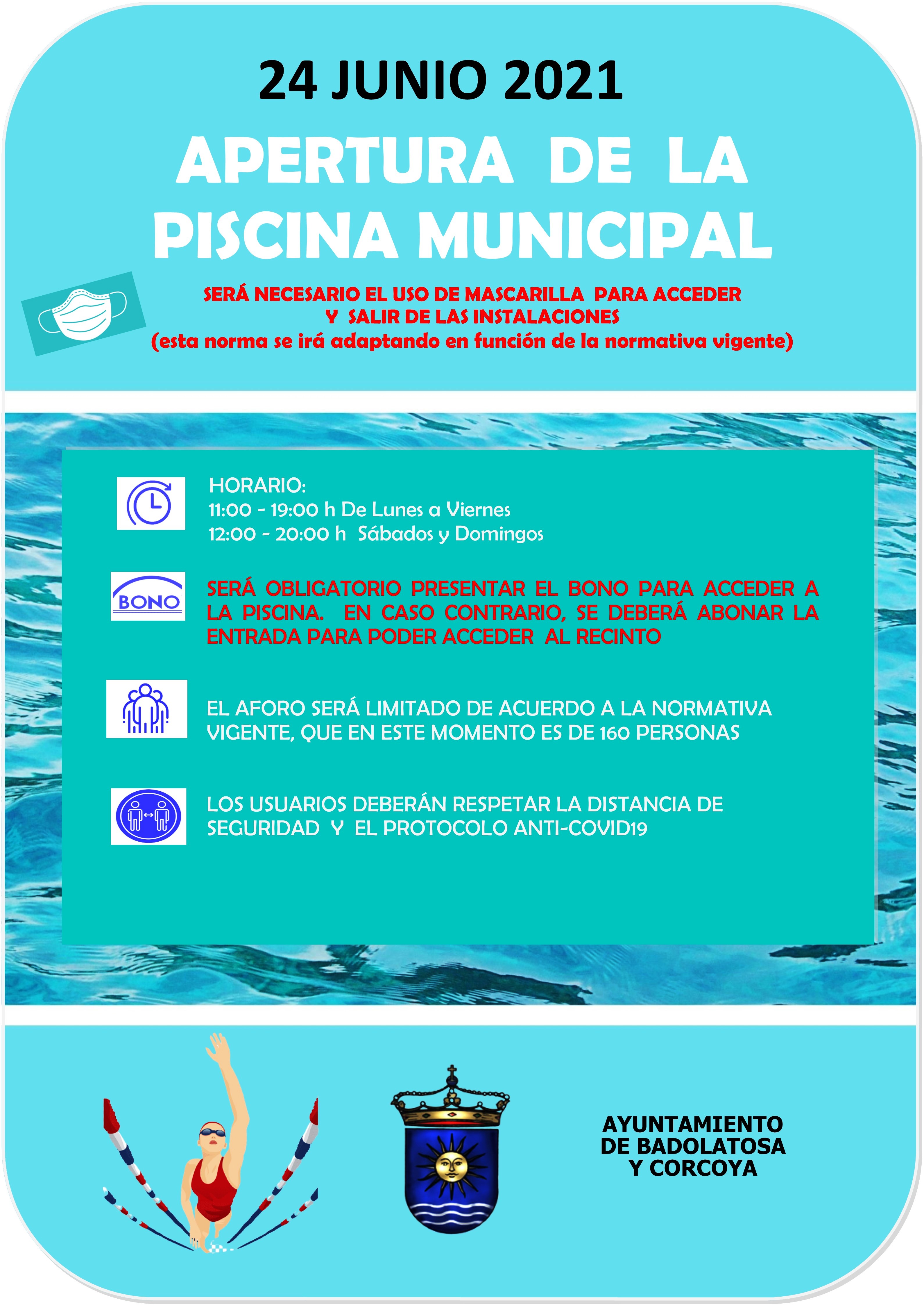 El verano ya está aquí y este año, aunque con limitación de aforo y cumplimiento de la normativa antiCovid19, podremos disfrutar de la temporada de baño en las piscinas municipales de Badolatosa y Corcoya, que abrirán sus puertas el jueves 24 de Junio.