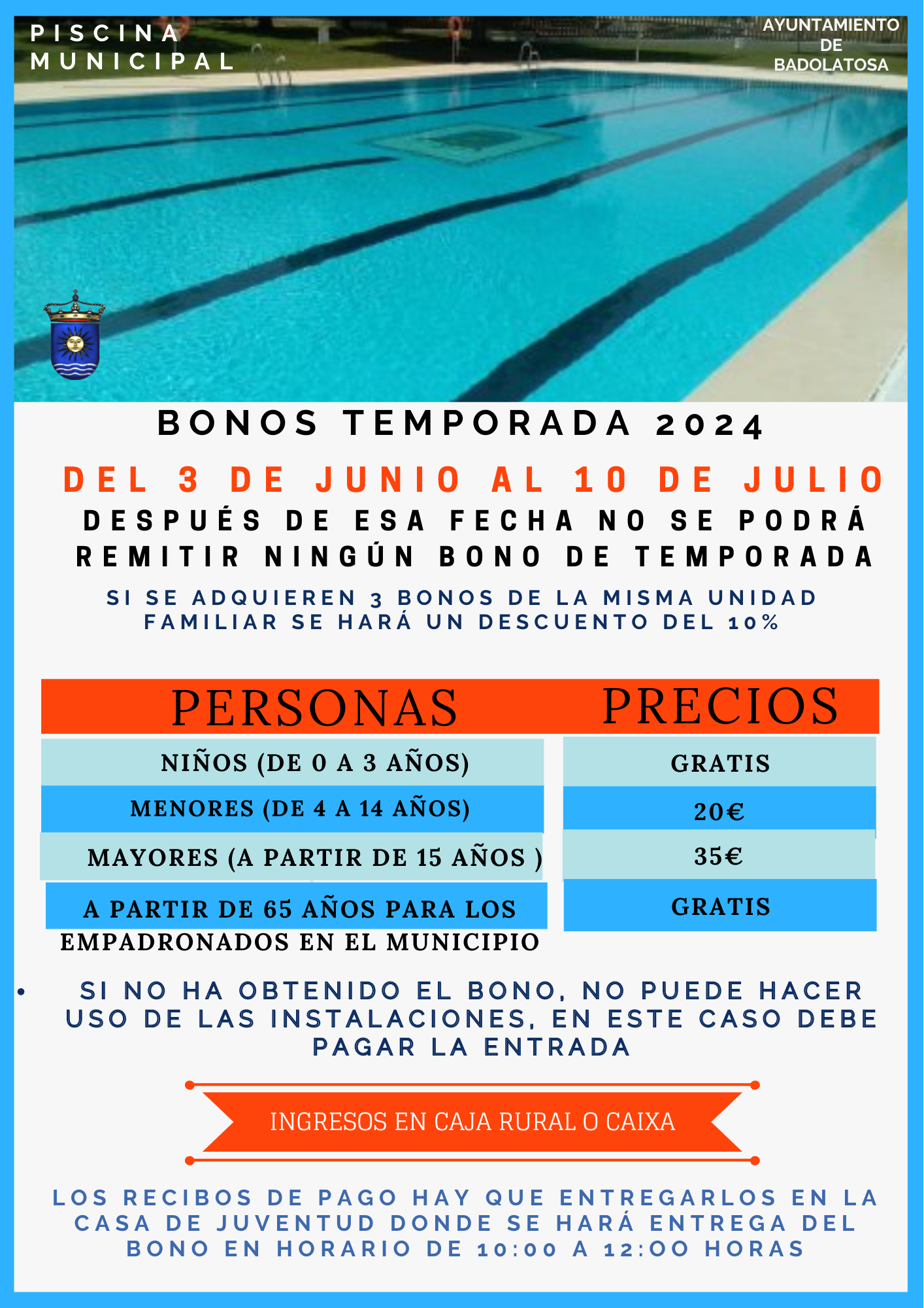 LOS BONOS PARA LAS PISCINAS DE BADOLATOSA Y CORCOYA TEMPORADA 2024 PODRÁN SOLICITARSE DEL 3 DE JUNIO AL 10 DE JULIO