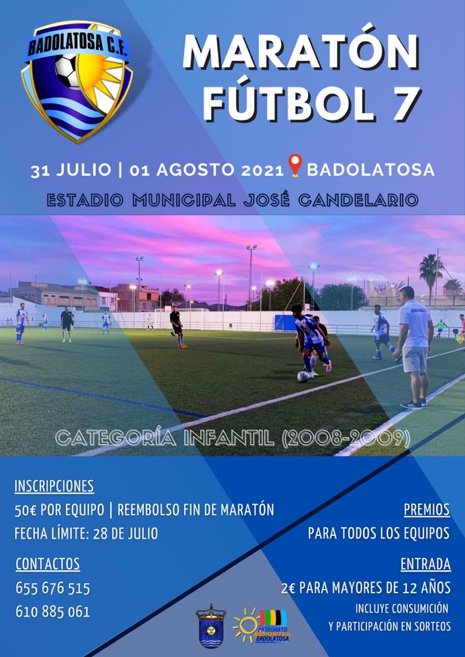 La Maratón de Fútbol 7 de este verano, organizada por el Badolatosa Club de Fútbol con la colaboración de nuestro Ayuntamiento se celebrará los días 31 de Julio y 1 de Agosto en el Estadio Municipal José Candelario. Será para la categoría infantil (nacidos en 2008 y 2009).