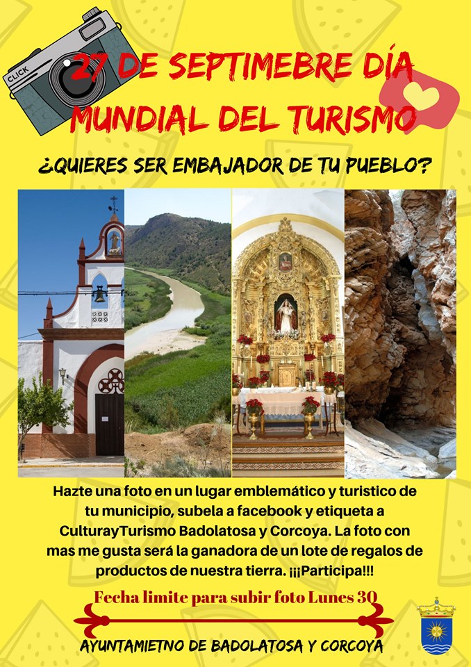 El Viernes 27 de Septiembre se celebra el Día Mundial del Turismo, y para conmemorarlo hemos puesto en marcha un concurso al alcance de tod@s, a través del facebook de CulturayTurismo Badolatosa Corcoya.