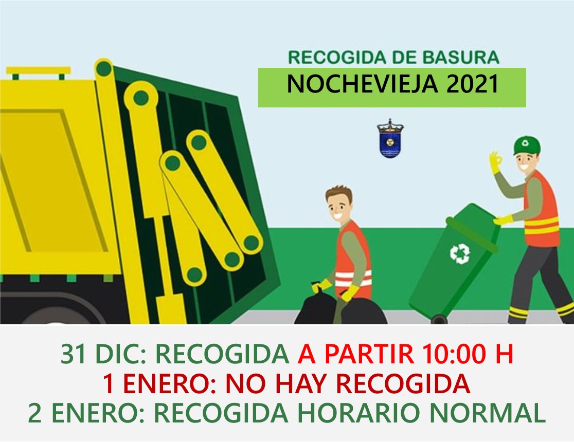Mañana 31 de Diciembre la recogida de basura será a partir de las 10,00 h. El 1 de Enero, Día de Año Nuevo, no habrá servicio y el domingo 2 de Enero la recogida de basura se llevará a cabo en horario normal.