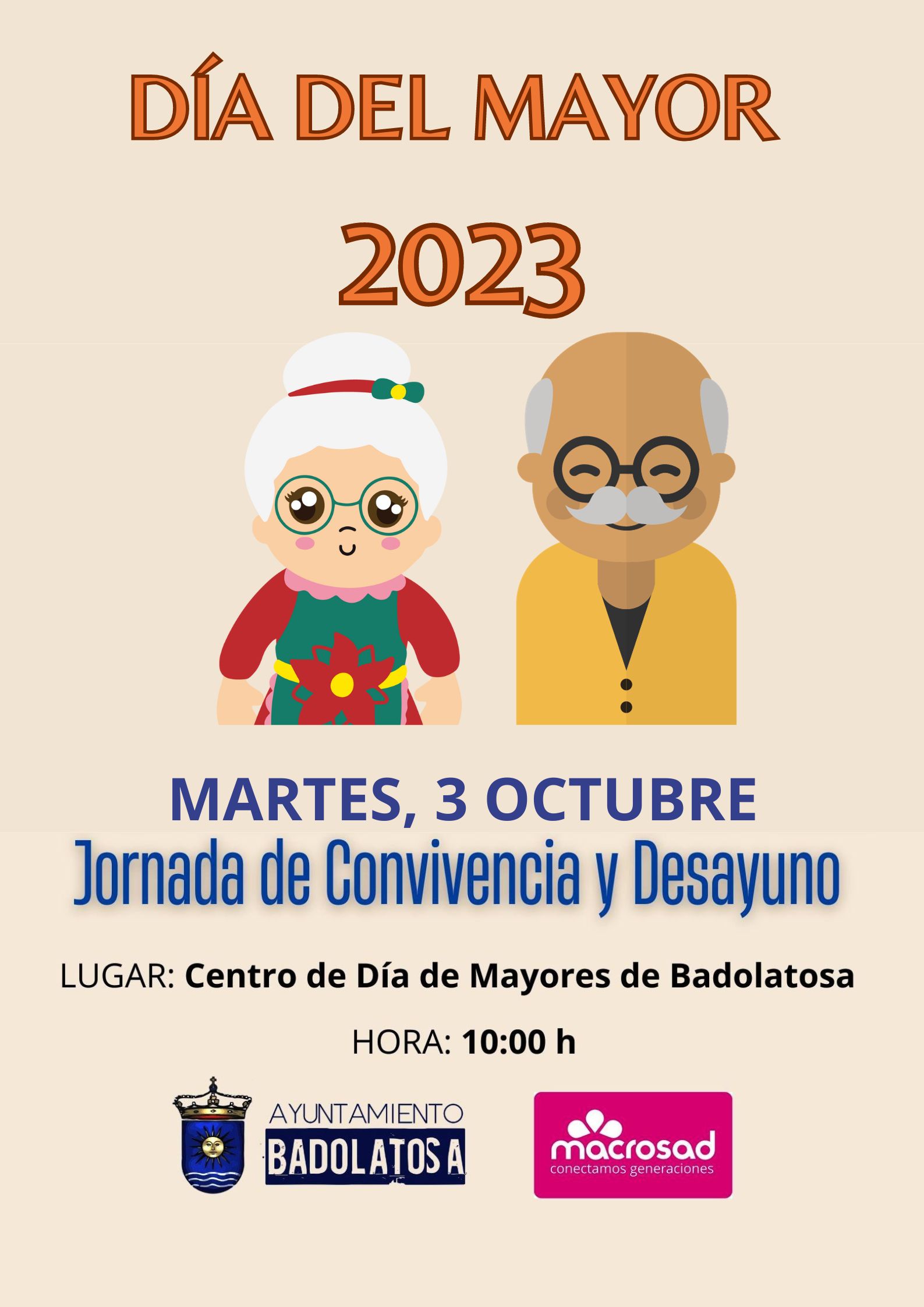 Ayer 1 de Octubre se conmemoró el “Día Internacional de las Personas de Edad” y un año más desde el Ayuntamiento se ha organizado una actividad especial para celebrar una fecha tan importante como lo es siempre cualquier reconocimiento a nuestros mayores. Por ello, mañana martes 3 de octubre, a las diez de la mañana, se realizará una Jornada de Convivencia y un desayuno en el Centro de Día de Mayores de Badolatosa.
