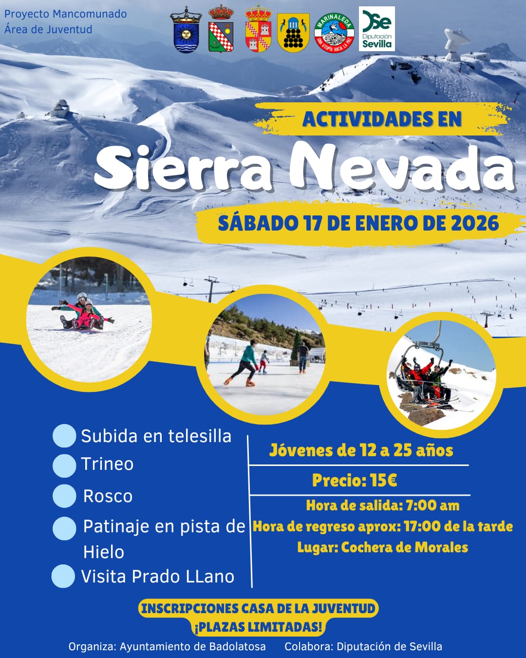 La Delegación de Juventud del Ayuntamiento de Badolatosa y Corcoya pone en marcha una atractiva jornada de actividades en Sierra Nevada el próximo sábado 17 de enero, dirigida a jóvenes de entre 12 y 25 años (a partir de 1º de ESO). Una iniciativa pensada para disfrutar de la nieve, el deporte y la convivencia juvenil en un entorno natural incomparable.